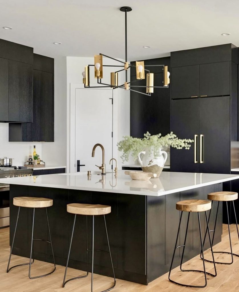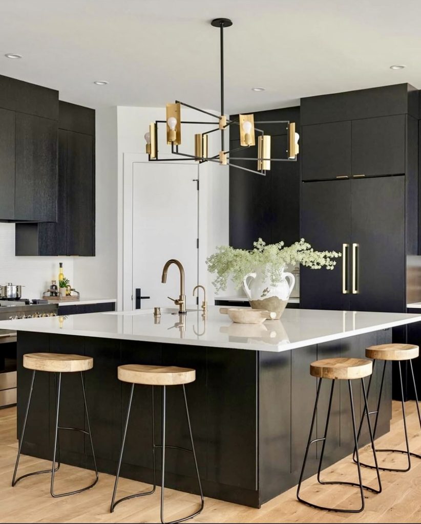 This design shows how black kitchens can feel bright and modern when paired with generous white surfaces, from the island slab to the high-gloss countertops. The minimalist black cabinetry forms a sleek backdrop, allowing the warm wood stools and brass accents to introduce softness and shine without compromising the streamlined look. The striking geometric chandelier adds personality and confidence, making the space feel editorial while still being highly functional for daily cooking around the sink and island. It’s an excellent example of balancing high contrast with warmth in a family-friendly layout.