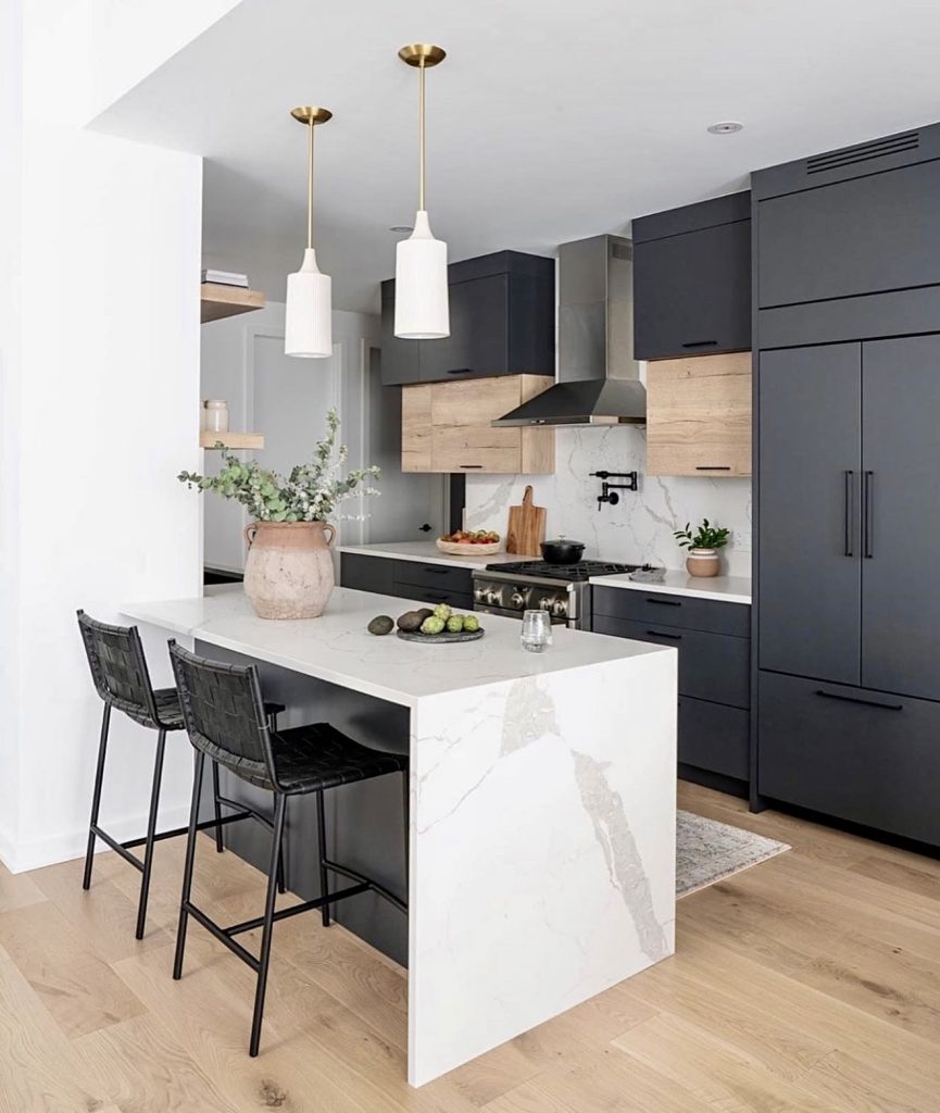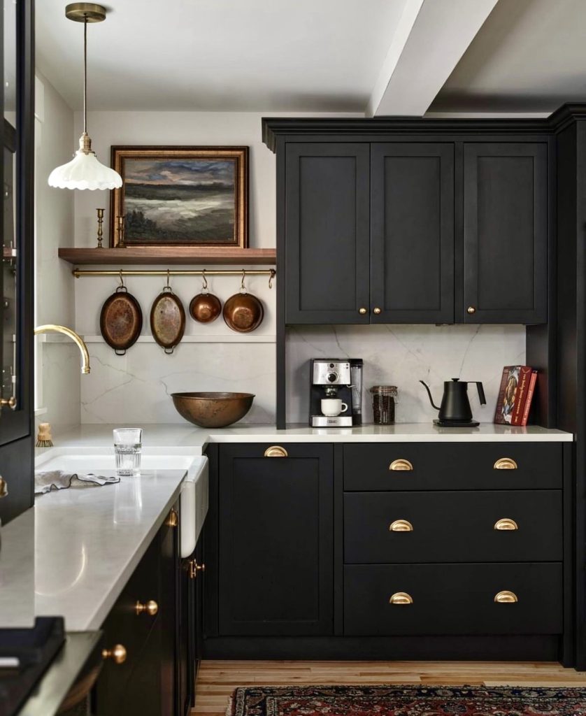 This kitchen embraces a polished modern style with black cabinetry, pale wood and accents, and dramatic white and veined countertops that instantly elevate the space. The blend of materials feels intentional and warm, inviting natural texture into what could otherwise be a stark design. Brass details and layered accessories add subtle charm, while the compact island offers functional workspace without overwhelming the room. It’s a smart design approach for smaller homes or condos where style and efficiency must work hand-in-hand, showing how mixed finishes can keep a black kitchen feeling approachable.