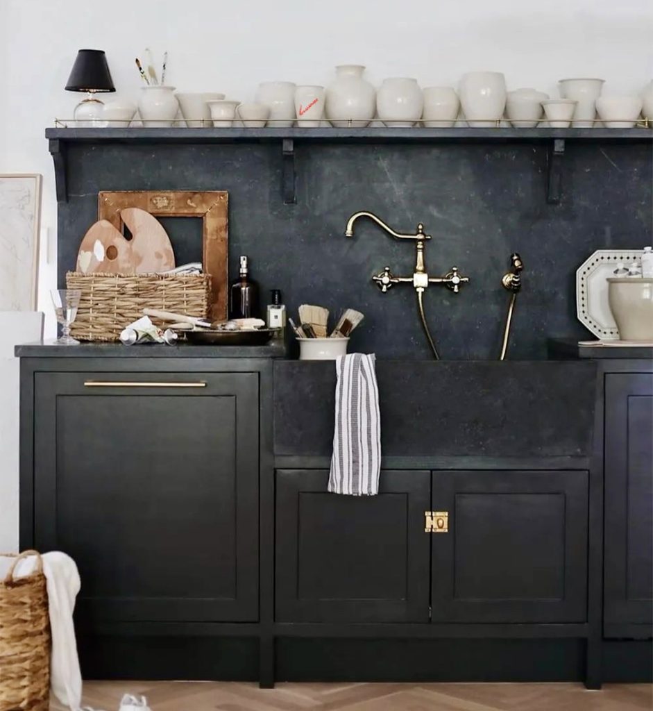 Combine creativity and functionality in a kitchen by matching the use of black cabinets and a black stone sink with warm and stylish brass lighting. The custom ceramic-topped open shelf provides the kitchen with an artistic and almost lovely suspicious appearance, like the workspace designed by an aesthete. The monochrome theme keeps all the furniture in its proper perspective, and the use of woven baskets provides a touch that softens the space. Rather, the black kitchen has got all the makings of an artistic space.
