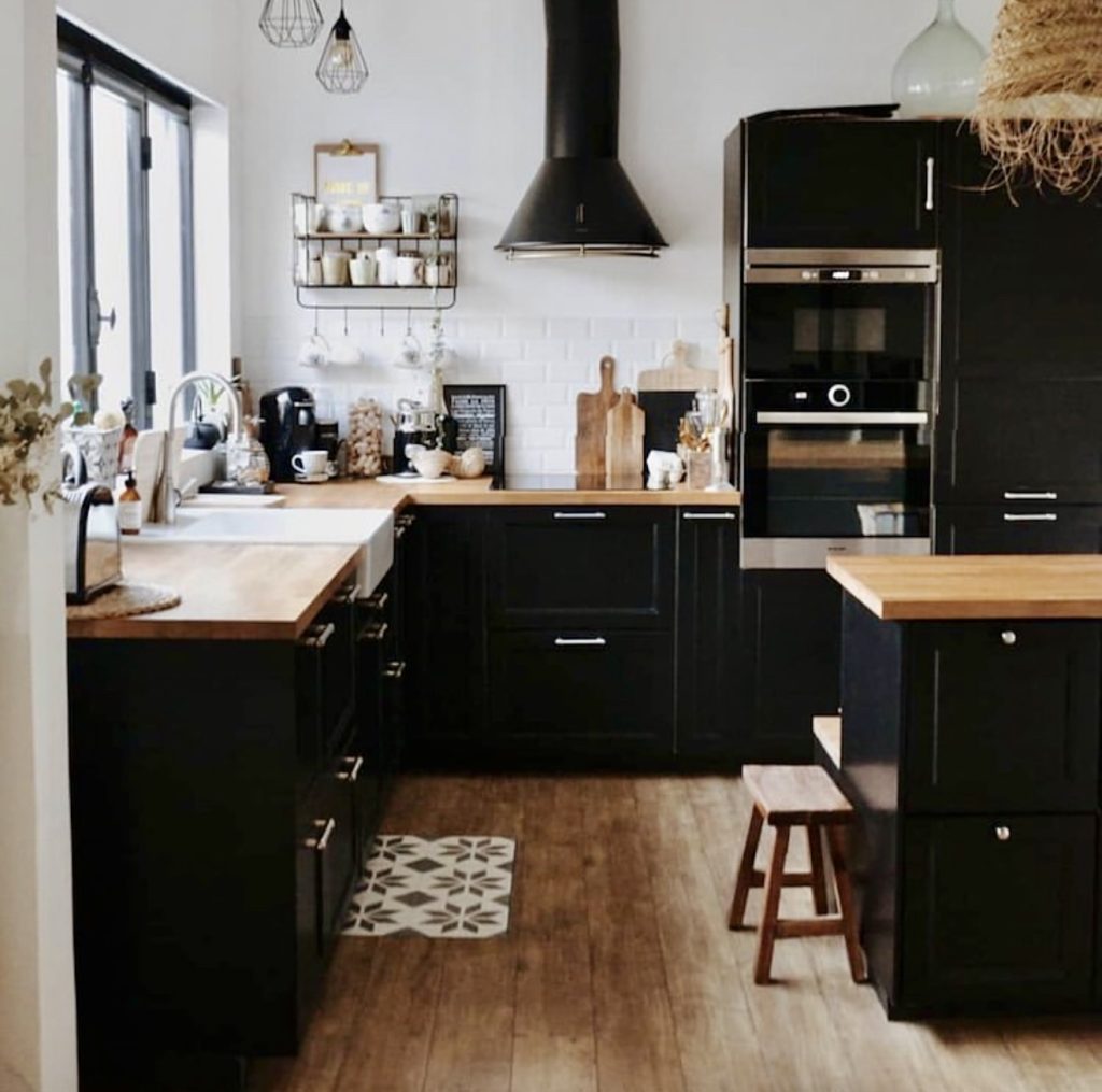 Here, the charm of black cabinetry meets the coziness of butcher-block countertops, creating a look that feels inviting rather than severe. The mix of open shelving, white tile, and warm wood accents introduces the kind of layered decor often seen on interior-influencer accounts like Chris Loves Julia. This combination shows how a black kitchen can lean nostalgic while still feeling updated, especially when paired with personal touches like curated mugs, textured stools, and soft ambient lighting.