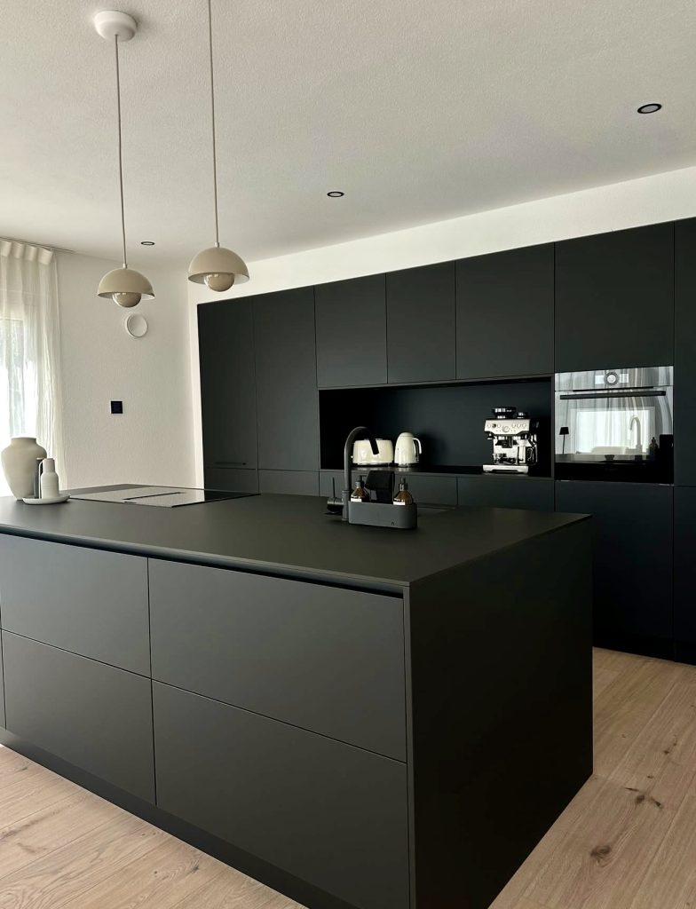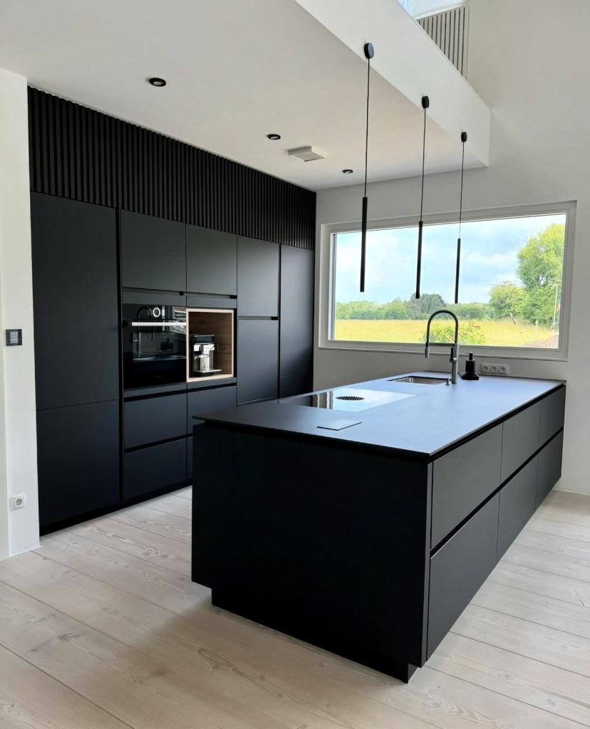 This striking design leans fully into matte black minimalism, featuring seamless floor-to-ceiling cabinets and a monolithic island that defines the room with sculptural precision. Subtle cream-toned pendant lights add contrast without breaking the visual simplicity, offering just a hint of cream and softness against the deep matte backdrop. The clean architectural lines and integrated appliances give the space a quiet, elevated luxury feel, the kind you often see featured in design-forward outlets like Dezeen. For anyone who values order and calm, this space provides refreshing clarity and modern inspiration.