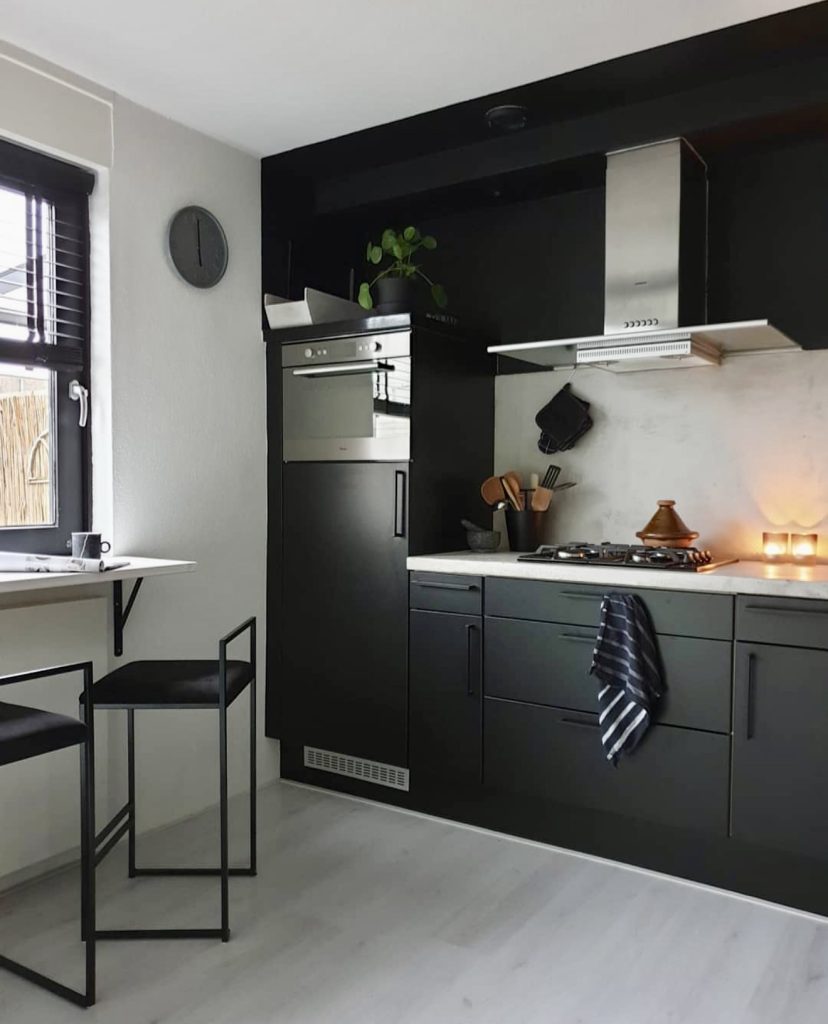 21. Compact Black Kitchen with Smart Space-Saving Design