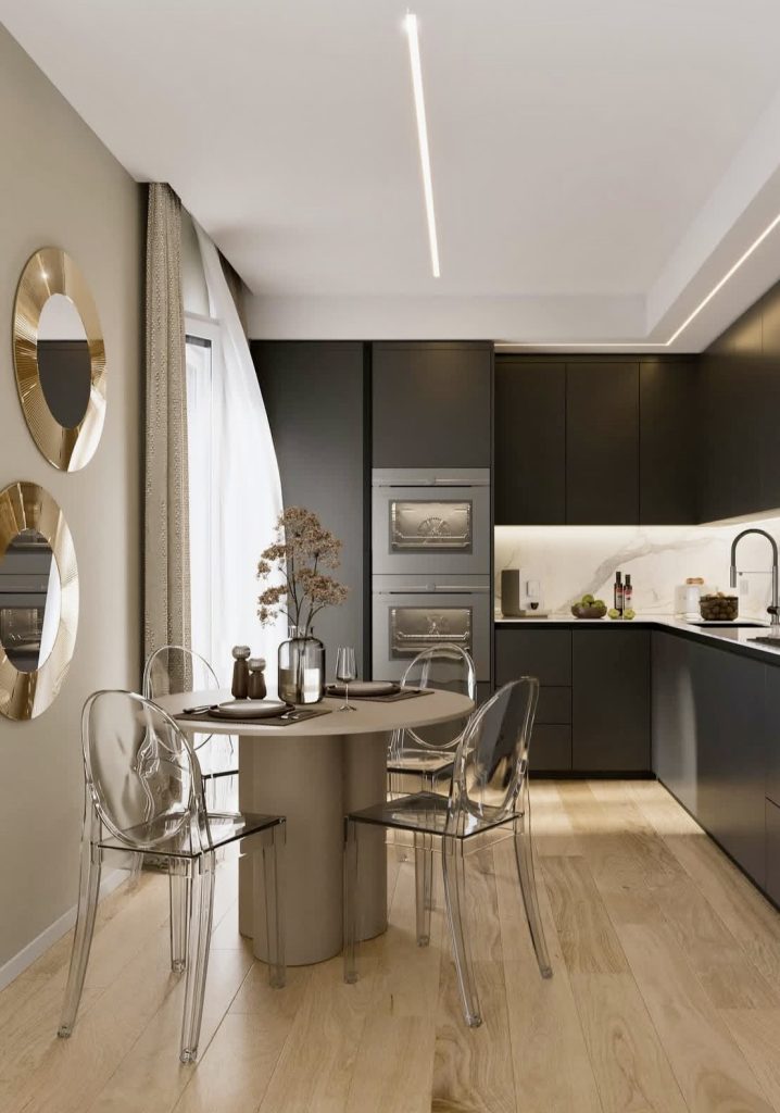 This space exemplifies the concept of blending the themes of elegance and modernism, where the room hopes to provide the observer with beauty and elegance. The space incorporates the use of unbroken, matte-black cabinetry, paired with light and soft materials like gold. The space incorporates the concept of seamless whites and a marble backsplash, making the space appear much lighter. The use of the curvaceous dining table and the transparent chairs provides a touch of modernism. This space exemplifies modern cabinet design ideas in the theme of elegance.