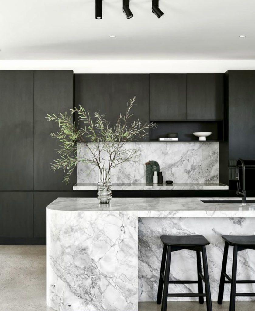 23. Sculptural Marble with Deep Black Cabinetry