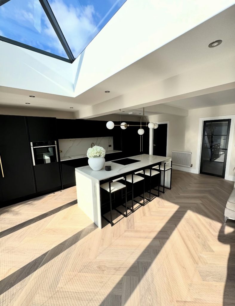 This airy kitchen benefits from abundant natural light thanks to the oversized skylight, allowing the black cabinetry and island to anchor the space without feeling too heavy. The white waterfall island brightens the center of the room, while sculptural lighting adds a refined, contemporary touch. Pale wood flooring brings warmth to the palette and helps create a smooth transition between the kitchen and surrounding living areas. It’s a masterclass in balancing bold color with openness, making black kitchens feel expansive rather than enclosed.