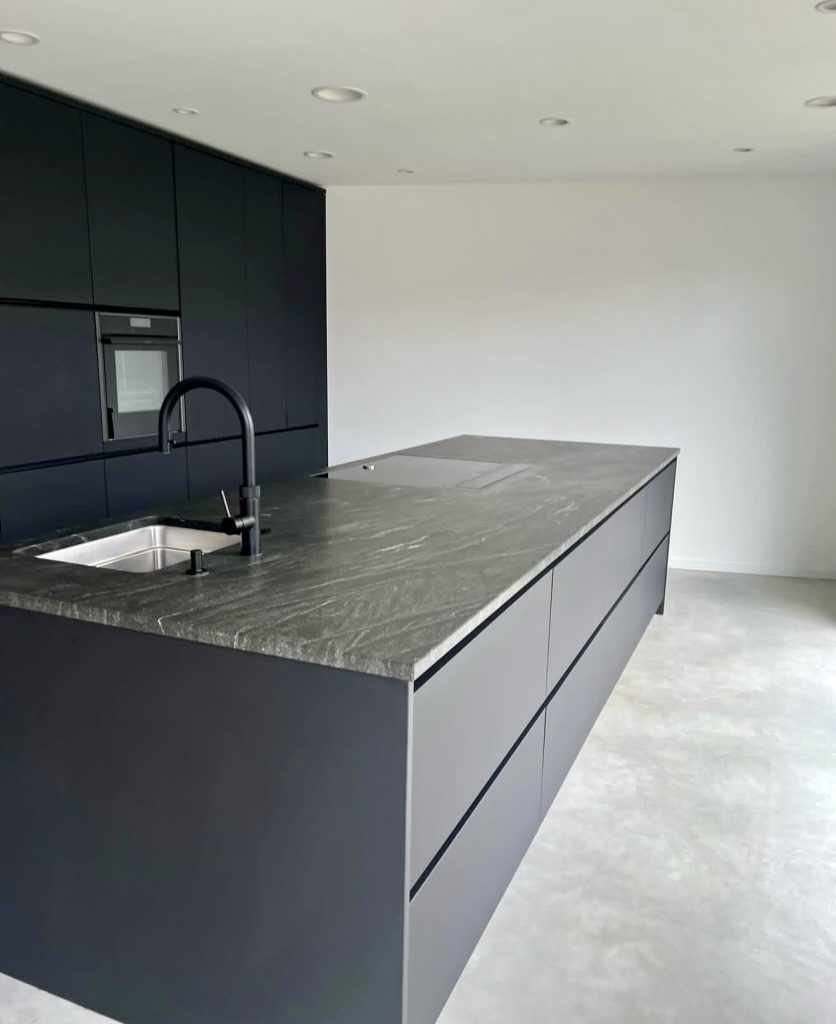 This kitchen embraces the beauty of restraint with matte black cabinetry, integrated sink design, and a richly textured stone countertop surface that becomes the room’s focal point. Clean lines and a wide, uninterrupted island give the space a peaceful modern feel, while the soft gray floor brings in a subtle taupe and tonal harmony. For homeowners who love sleek minimalism, this kitchen offers a calming, uncluttered solution—one that feels both practical and quietly luxurious.