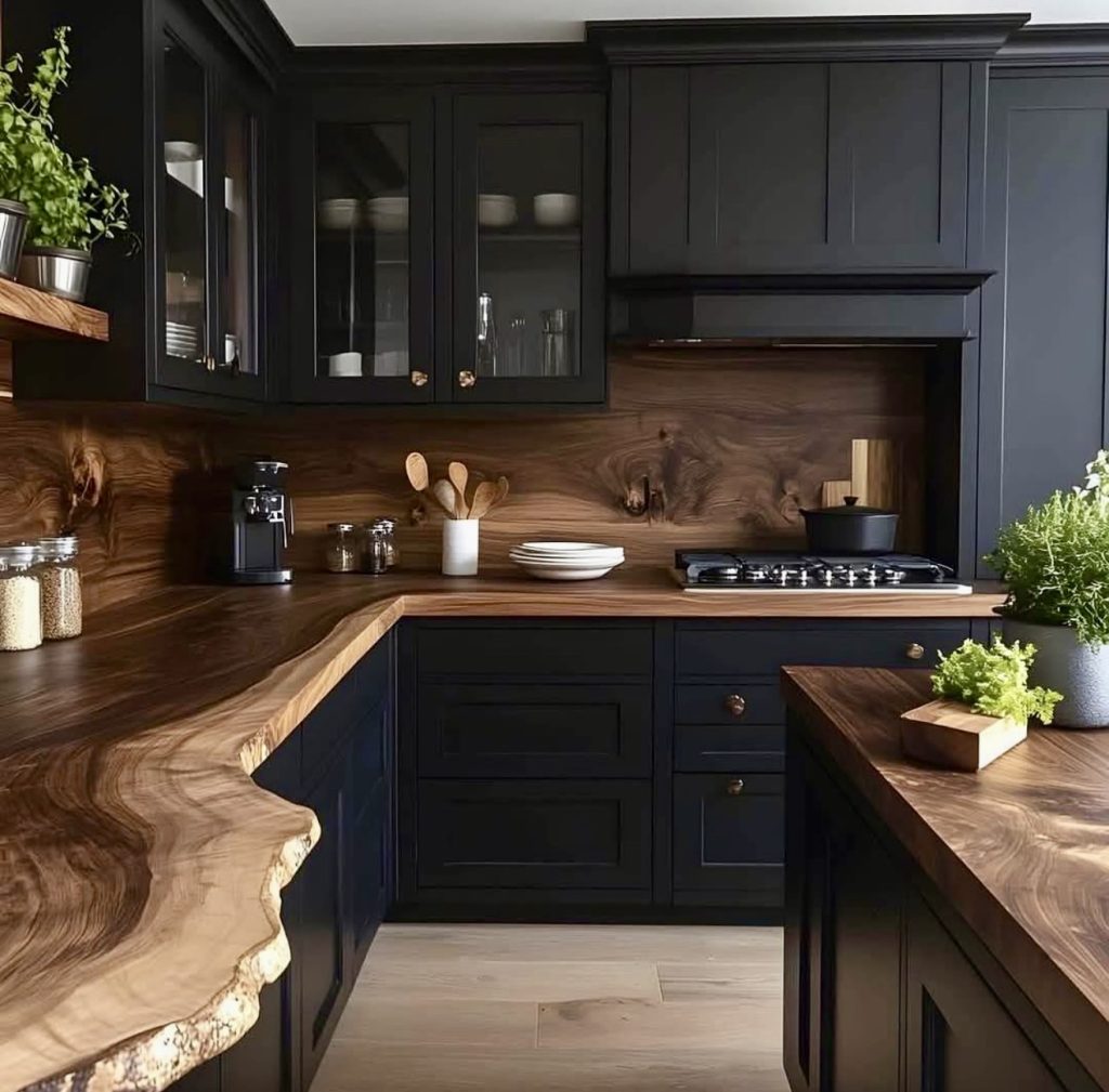 Few kitchens strike a balance between organic texture and bold color as beautifully as this one, where richly grained wood countertop surfaces flow seamlessly into matte black millwork. The deep tones enhance the natural patterning of the wood, creating an earthy-meets-modern mood perfect for anyone drawn to dark green or sage green palettes elsewhere in their home. Brass hardware and glass-front upper cabinets add refined details that elevate the entire design, making this space ideal for warm, rustic-modern living.
