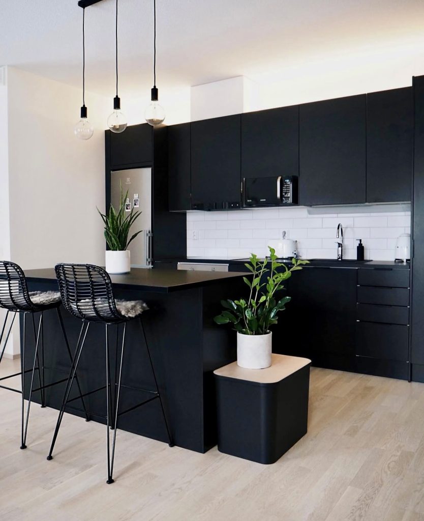 Combine modern style and functionality in the kitchen through the use of modern black cabinetry, black countertops, and splashy greenery. The modern, clean lines in the cabinetry and countertops contrast with the warm, light-wooden stools and help create a Scandinavian-inspired style. The use of plants in the kitchen provides the much-needed contrast in the space and takes the kitchen back to nature. In fact, the modern black kitchen has got all the elements needed in a typical comfortable and modern space.