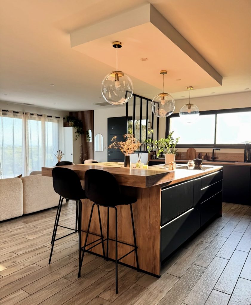 This kitchen blends black, natural wood, and soft golden light to create a warm, contemporary look ideal for open-concept homes. The generous island with its wood and black combination becomes the heart of the layout, working equally well for cooking, conversation, or casual dining. Globe pendants introduce an elevated touch, while thoughtful styling keeps the room from feeling overly formal. It’s a strong example of how black cabinetry can be softened with white oak tones and subtle metallic details to create a truly inviting atmosphere.