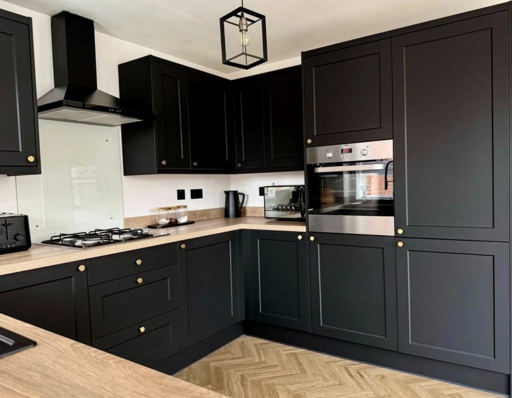 This kitchen brings a timeless twist to the black-kitchen trend by pairing classic shaker cabinets with warm wood countertop surfaces and brushed brass hardware, creating a look that feels both traditional and refreshingly current for 2026. The neutral wood tones soften the bold cabinetry and add a grounded, homey quality that many American homeowners appreciate, especially in family-oriented spaces. Clean-lined appliances and a simple glass splash panel keep the layout uncluttered, while the matte finish reinforces the kitchen’s sophisticated yet practical aesthetic—making it perfect for anyone wanting a blend of comfort and style in everyday cooking.