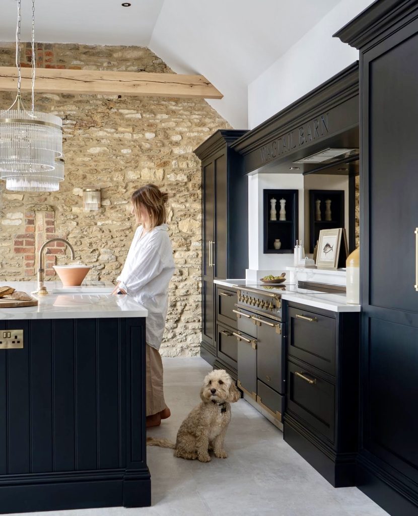 This beautifully layered design blends bold black millwork with natural stone walls and warm timber beams, creating a kitchen that feels both historic and thoroughly updated. Brass hardware and a classic range add touches of understated luxury, while the crisp white and countertops brighten the darker tones and prevent visual heaviness. The mix of old-world texture and modern cabinetry shows how black kitchens can feel deeply personal, especially when paired with organic surfaces—an approach frequently praised by designers like Jean Stoffer for its soulfulness and durability.