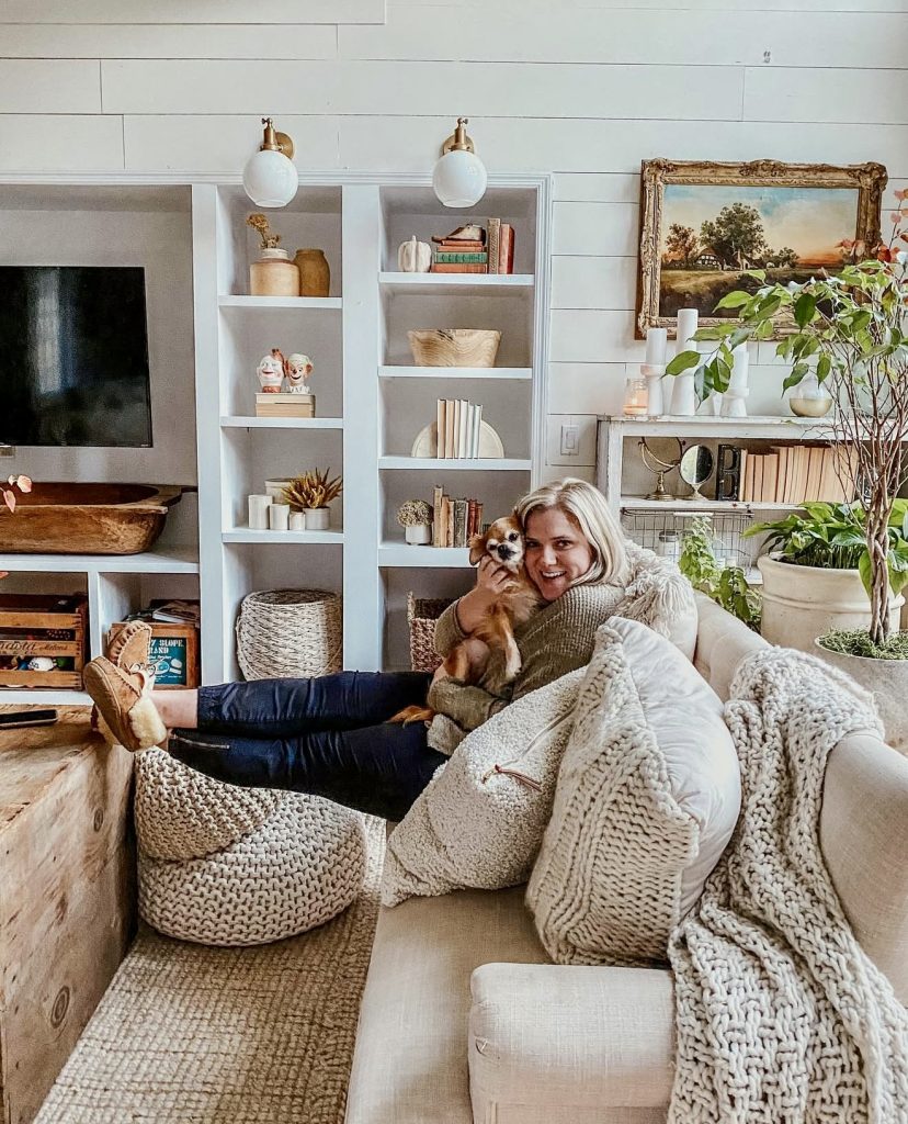 Built-ins can also work effectively if integrated into warm textures. In the given image, the combination of warm textures produces the much-needed effect for the room’s emotional temperature. Shelves are made of wood, contributing significantly towards the neutral architectural theme. Additionally, the television doesn’t dominate the room. Instead, it integrates effectively into the room’s décor. Other contributing elements in the room’s warm temperature include knitted clothing, wood furniture, and natural plantation.
