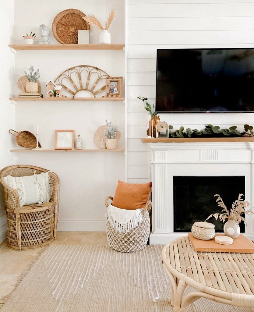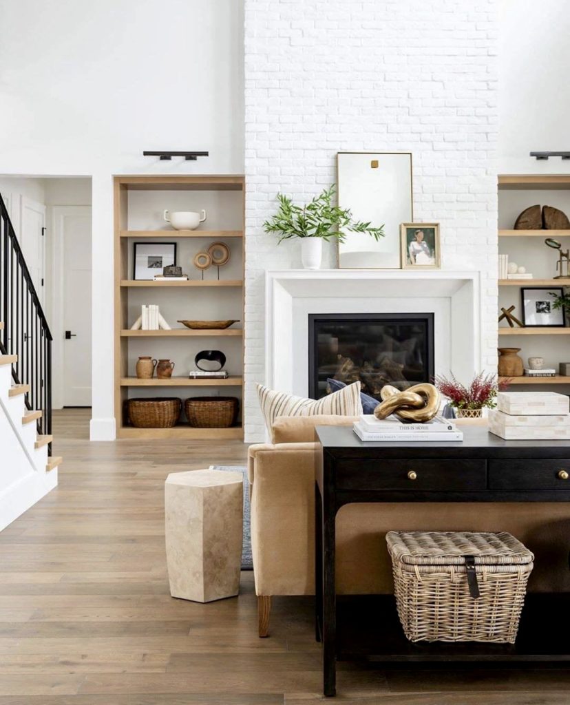 Built-in shelves don’t always work in small living areas with high ceiling structures that contain beautiful fireplaces. However, in the given setup, the symmetrical built-ins effectively bring life to the room’s height. White wood shelves work beautifully along with the painting on the bricks. Every single one of the built-in shelves is beautifully designed by combining natural vases and artworks along with natural hues. This setup is the epitome of ‘less is more.’