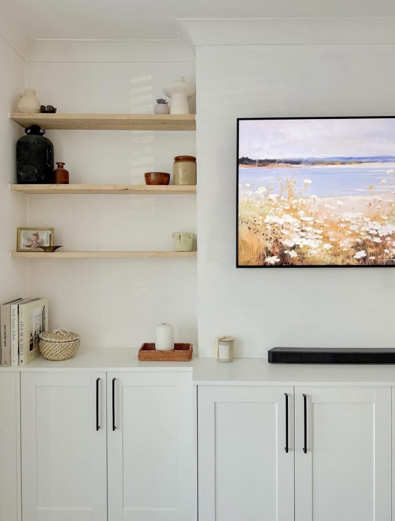 17. Minimalist Floating Shelves Alongside the Clean Media Wall