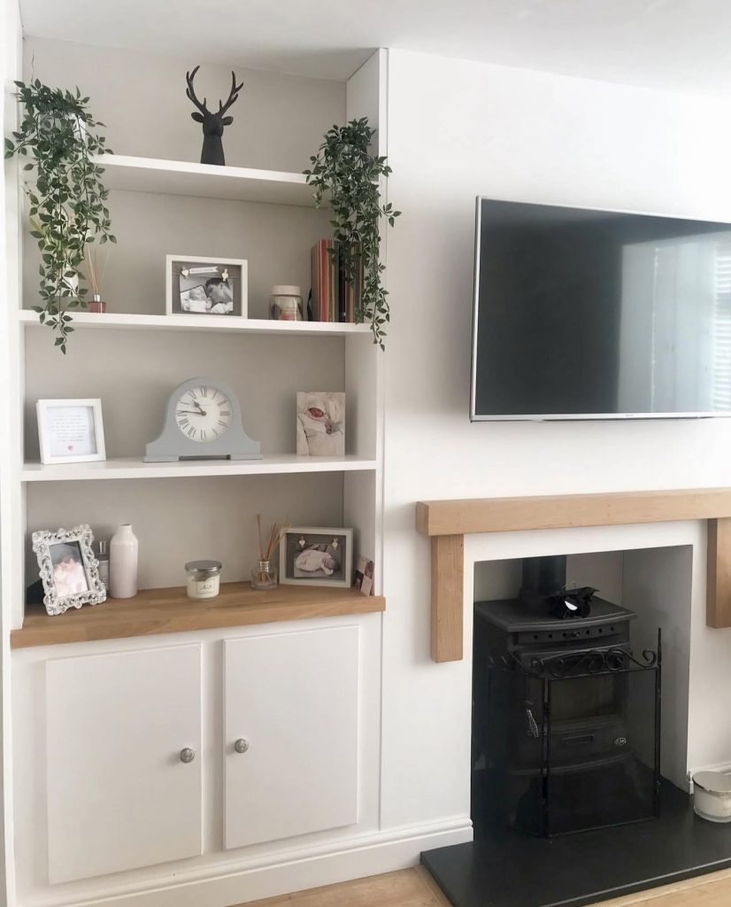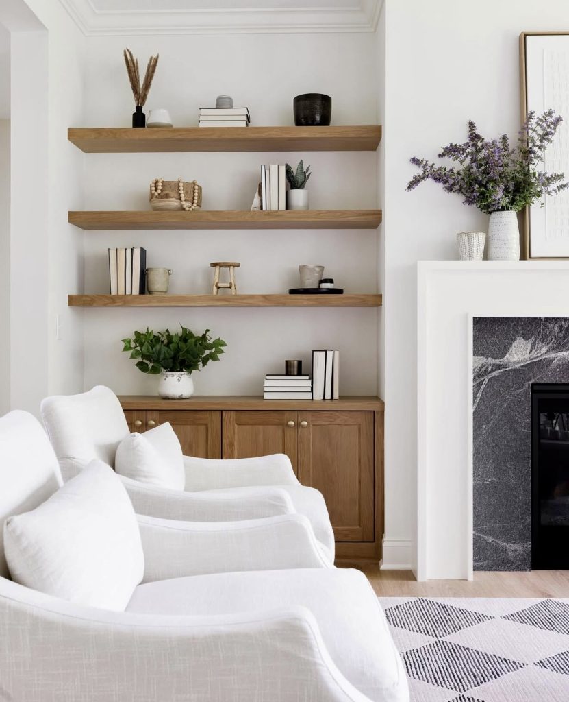 Neutrals and wood accents on the shelving keep the alcove feeling airy and simple. Minimalist alcove shelving like the one in the image below has been rising in popularity in 2026 for people who want a warm yet simple décor. Minimalist alcoves provide enough room for some decorative styling while also giving enough space for the room to appear spacious. Such alcoves are great for small homes that consist of apartments. This room also serves as the best representation that in build-ins, much effort is not needed by them to make their impact.