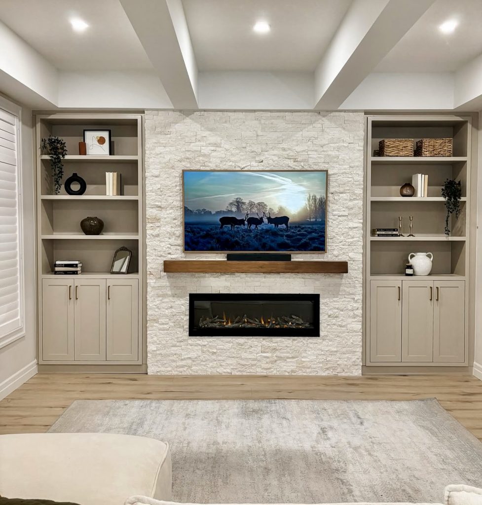 2. Stone-Faced Built-Ins Framing a TV and Electric Fireplace