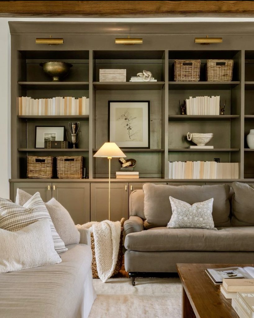 These deep-toned built-ins prove the best way to make lighting components work in the room. Brass picture lights work wonders on the whole unit by adding the effect of the display wall in the room. The display wall in the room incorporates various styling elements like woven baskets, decor sculptures, and low-colored books. These cabinets also provide storage in the room. That’s why it’s the perfect choice for people who want the storage unit in the room to look both stylish and luxurious. It’s the perfect representation of 2026’s warm-styled architectural designs.