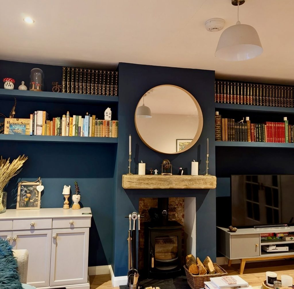 Perhaps the quintessential living room within the context of the cozy culture of America might involve the combination of rustic fireplace mantels with contemporary built-ins. However, the navy blue color on the shelves gives the room its personality. Additionally, the rustic wood on the fireplace brings the room’s atmosphere together. However, the room’s functionality might be enhanced by the installation of built-ins on all the sides of the room where the object exists. This might work particularly effectively in older homes.