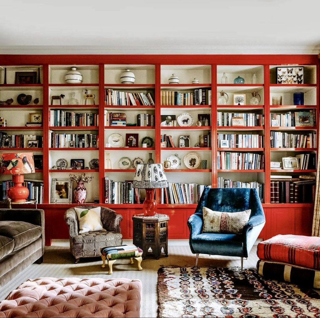 Perhaps the most decorative aspect of the living room might involve the installation of built-ins featuring bold color. Such deep red wooden borders make for a vibrant architectural framework surrounding the room’s wall. This turns the simple wall into an immersive library room. Also, the combination of components like books, art, table lamps, and antiques in the room gives the room its intricate nature—it’s ideal for individuals who love designing their homes in the decorative rather than the minimalist fashion. Additionally, the room’s ample storage in the form of the various bookshelves allows for easy styling variations throughout the year.