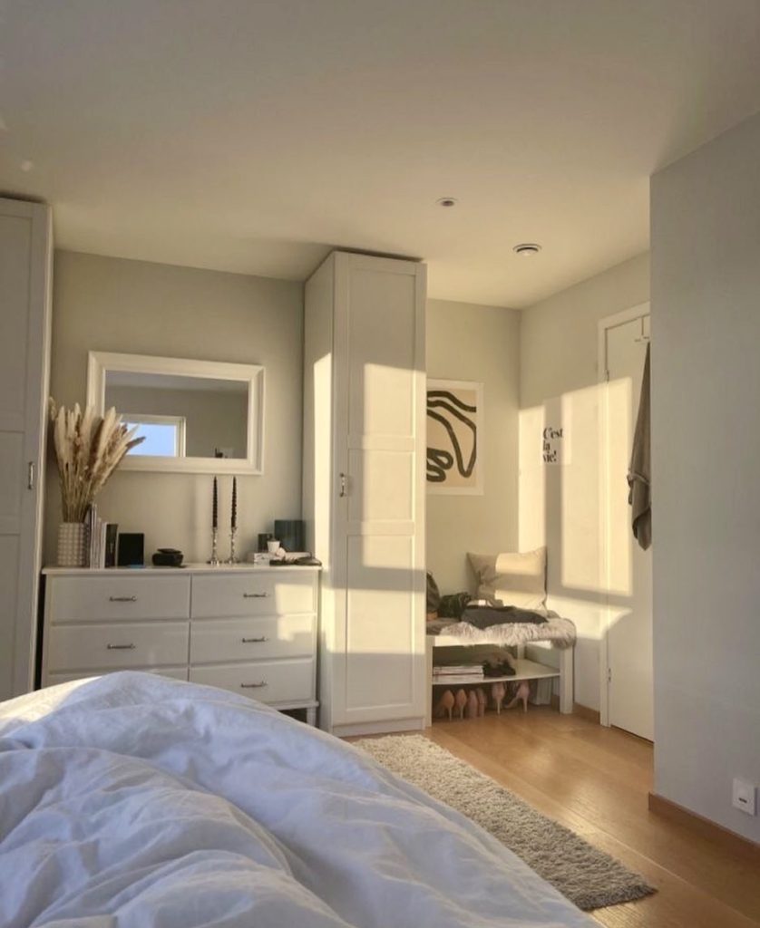 Sunlight becomes the main design element in this room, washing over white cabinetry and warm wood flooring to create an effortless calm that aligns perfectly with the clean room aesthetic. The soft palette—white, beige, and muted grey—keeps the space serene without stripping away personality. The subtle styling on the dresser and the tidiness of the bench area reflect a lifestyle that values clarity while still embracing cozy vibes. There’s a hint of minimalist small room energy here, but it’s warmed with natural textures that prevent the space from feeling stark, making it ideal for anyone balancing simplicity with comfort.