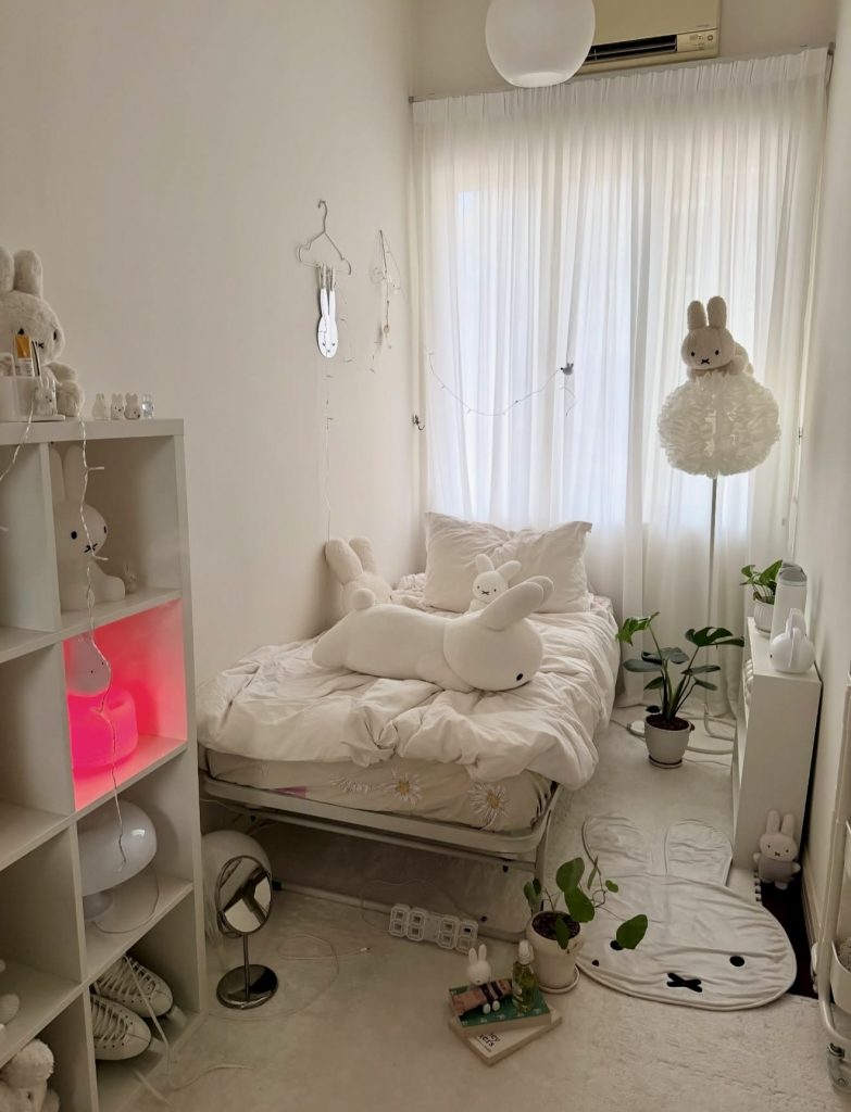 This compact room is a brilliant example of minimalist small room design, showing how even a tight layout can feel open, airy, and deeply comforting. The all-white palette, from the bedding to the shelving, amplifies the natural light streaming through the curtains, creating an almost cloudlike serenity. Soft character decor adds a playful twist rooted in adorable styling, while small plants bring pops of green that keep the room from feeling monotone. The result is a whimsical yet calming retreat—clean, sweet, and spacious in feeling, embodying the quiet charm many people seek in 2026.
