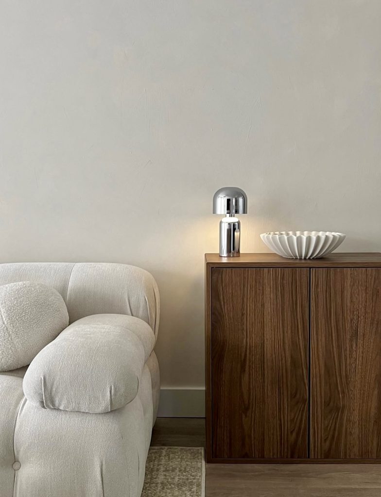 This scene captures the elegance of the clean room aesthetic of 2026 through a thoughtful balance of soft texture and bold sculptural design. The rounded sofa introduces a cloudlike comfort that leans into cozy vibes without adding visual clutter, while the rich wood cabinet brings grounding warmth to the minimalist palette. The chrome lamp and ridged ceramic bowl play with light and shadow, adding just enough contrast to keep the space from feeling flat. It’s a refined but approachable look—one that feels right at home in contemporary American apartments where serenity and style need to coexist seamlessly.