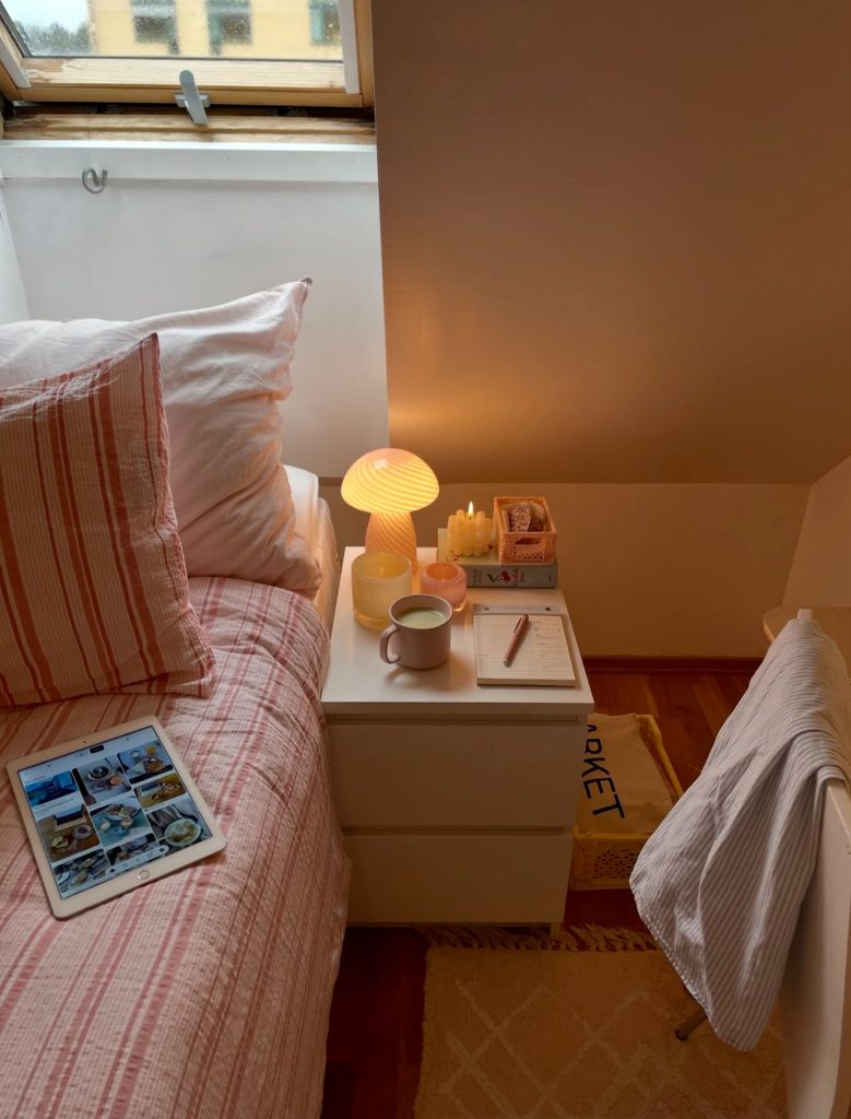 This small bedside moment glows with a sense of cozy vibes, celebrating the sweetness of everyday rituals. The striped bedding introduces a whisper of soft pink, creating a comforting palette that feels warm and personal. The gentle lamp light, scattered notebooks, and cup of matcha channel the relaxed ambiance often seen in lifestyle blogs and Sunday-reset videos. It’s an intimate, approachable style—one that leans into warmth, routine, and quiet comfort without losing the clean, uncluttered quality that defines this aesthetic.