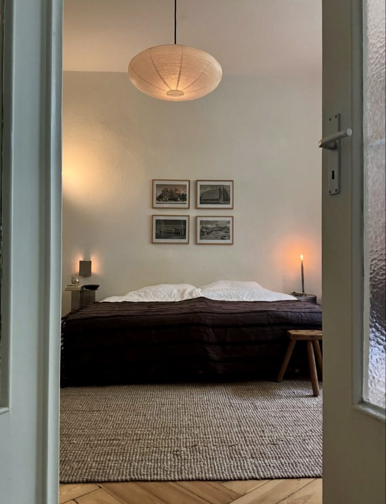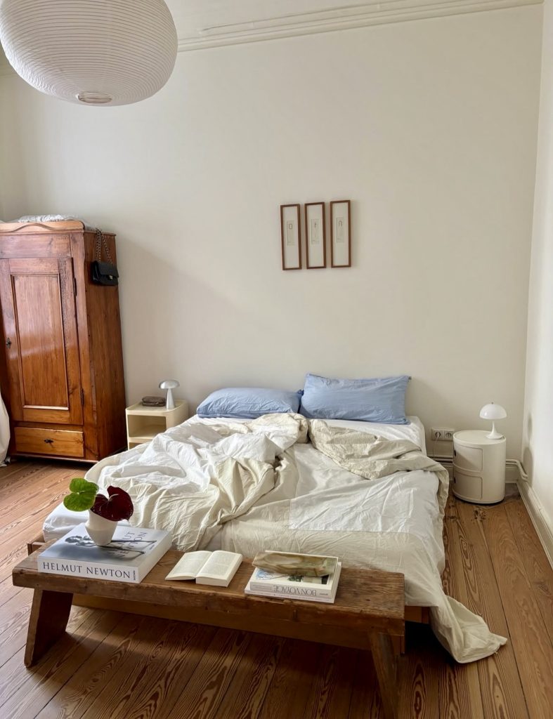 This room embodies a grounded, quietly stylish form of minimalism that many design editors predict will define the clean room aesthetic in 2026. The low bed, unmade in a charmingly messy but intentional way, gives the space natural cozy vibes without adding clutter, while the pale bedding and hints of blue maintain a soothing palette. The warm wood tones from the vintage wardrobe and bench anchor the room, creating a balance between modern restraint and subtle vintage character. It’s the kind of space that appeals to anyone craving calm, simplicity, and an effortlessly lived-in feel—proof that a room doesn’t need perfection to feel complete.