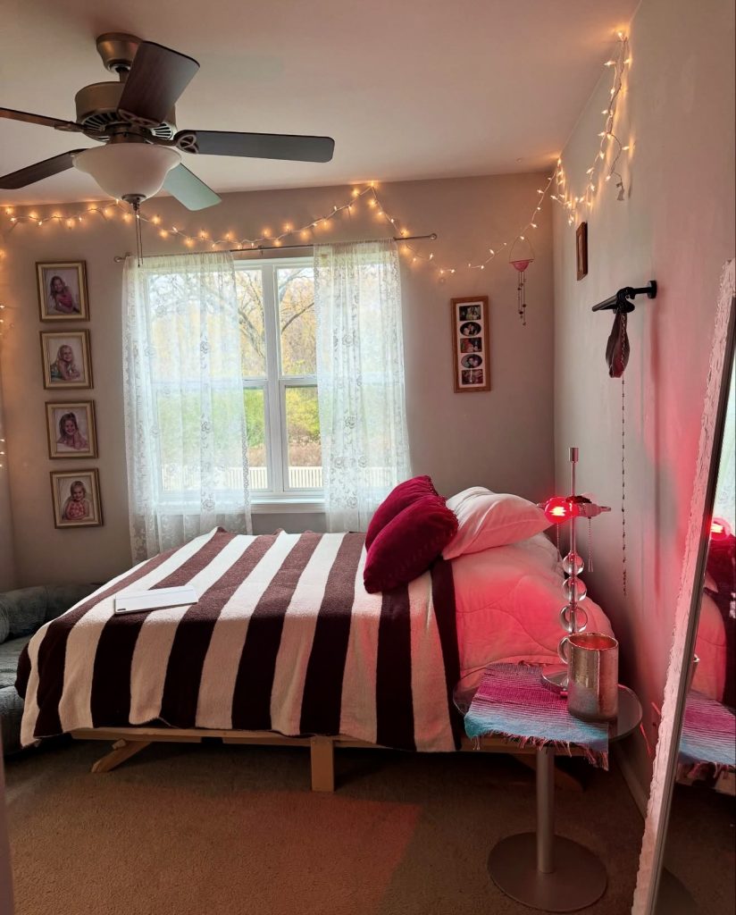 Here, the aesthetic leans into a charming, softly expressive version of clean living, where string lights add a glow that feels straight out of a relaxing ASMR video. The striped blanket brings structure to the layout, while the accents of deep pink create subtle girly energy without overwhelming the room. The combination of family pictures, layered textures, and airy white curtains strikes a balance between personal and polished—like a simplified take on a vision board that still stays tidy enough for everyday use. It’s an approachable style many American readers love: warm, slightly nostalgic, and inviting.