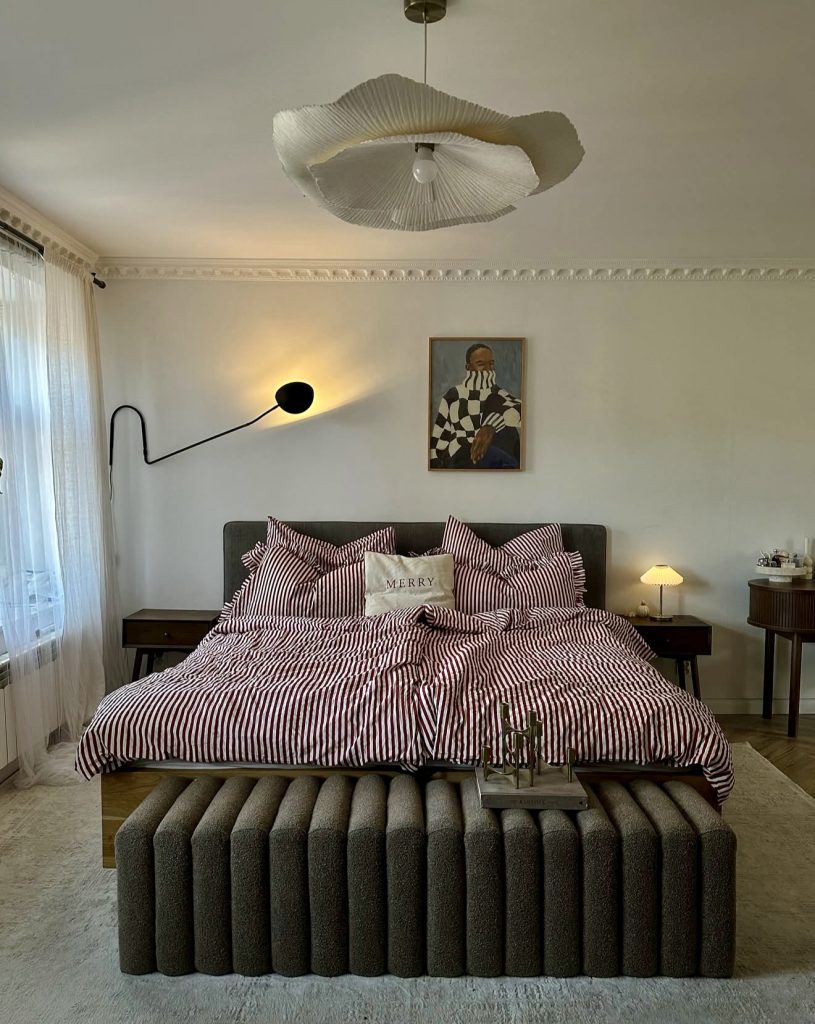 This bedroom captures an elevated approach to cozy dark styling, using deep brown bedding and sculptural lighting to create instant atmosphere while still keeping surfaces uncluttered. The clean vertical lines of the bench and the modern nightstands maintain the minimalist structure, while the warm glow of the sconces adds a sophisticated, almost hotel-suite feel. Subtle patterns and muted tones make the room ideal for anyone drawn to beige, black, or moody neutrals but still wanting a fresh, breathable layout—an aesthetic increasingly praised by editors at Domino and Clever for its calming impact.