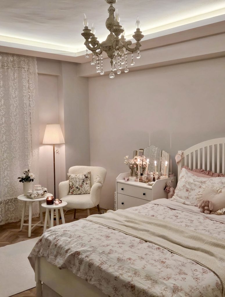 This room leans sweetly and romantically into the aesthetic and pairs soft florals with warm lighting and gentle modern-meets-vintage textiles. The detailed chandelier and lace curtains add a vintage sensibility to the white furniture and muted tones. Pink, whisper soft, and delicate grounds the space, balancing charm with maturity for those who like decor that is clean but decoratively soft. Cozy vibes are enhanced with layered bedding and glowing candles, and the gorgeous chaos of the room proves a space can be emotionally rich in comfort and deeply tidy.