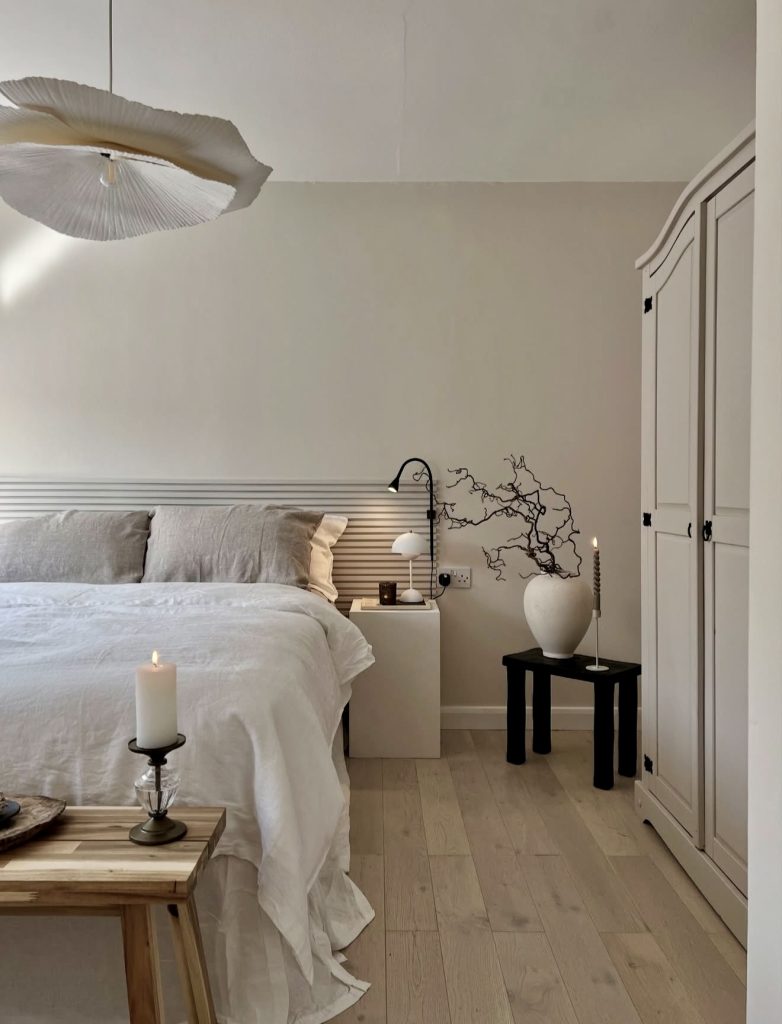 The room feels like a masterclass in refined minimalism, where clean lines, natural wood accents, and soft textiles work together to form a calming sanctuary. The palette leans on serene whites and muted neutrals, making it a beautiful example of the pink and white-adjacent softness popular in 2026 without actually turning overtly pink. The sculptural pendant light and organic branches add artistic interest, while the uncluttered bedside styling keeps the overall mood intentionally quiet. It’s the kind of design that appeals equally to men and women seeking clarity, comfort, and gentle visual order.