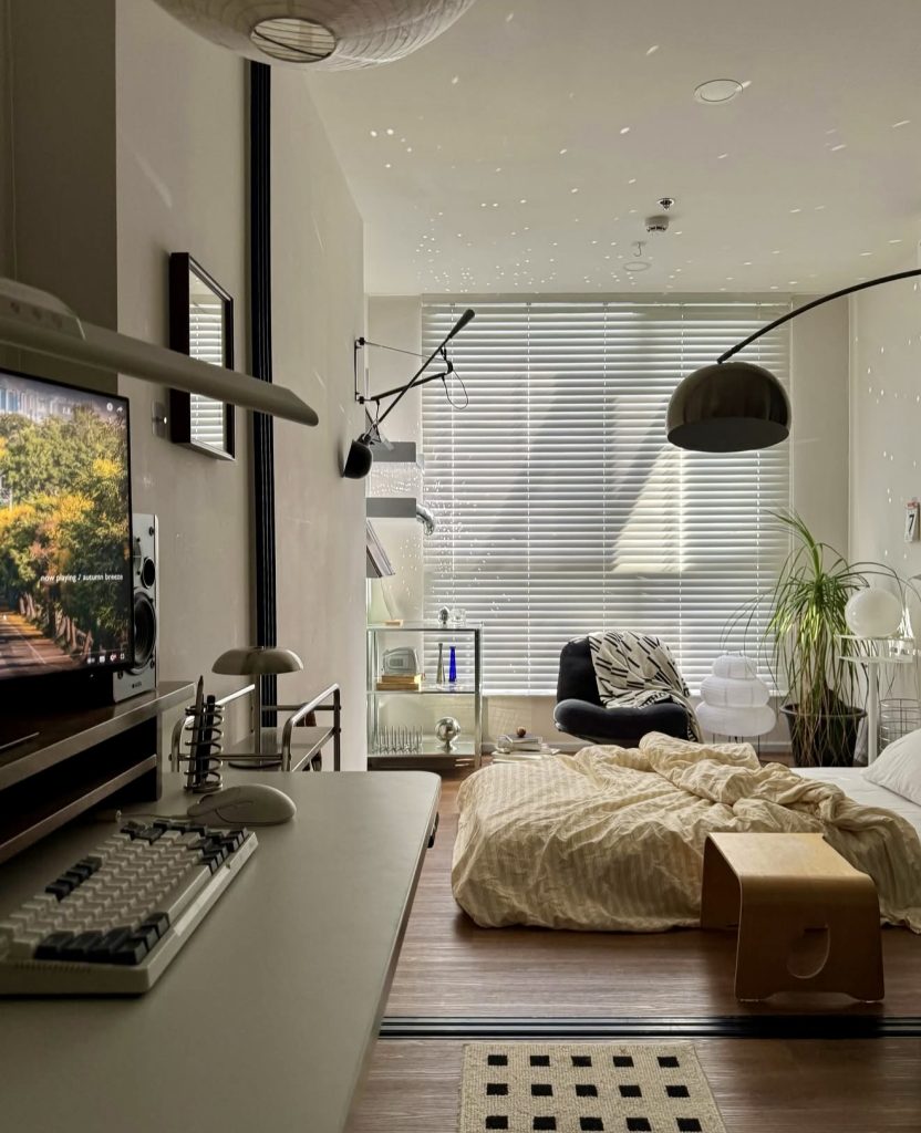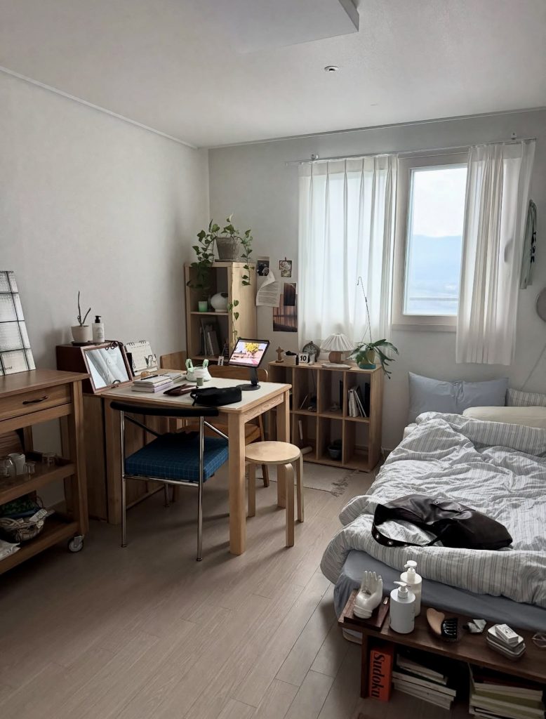 This room pairs a crisp, pared-back environment with soft personal touches, showing how the clean room aesthetic can easily intersect with everyday function. The open shelving and wooden furniture create a warm, natural structure, supported by pops of green from houseplants that instantly freshen the space. The sheer curtains diffuse daylight beautifully, maintaining a peaceful atmosphere that still supports productivity. It’s a wonderful example of how a clean room can feel both cozy and purposeful, especially for those who work or study from home.