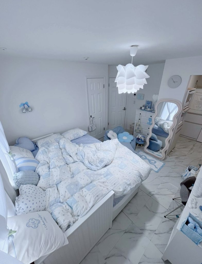 Here, the room leans into soft illumination to create a warm, almost magical sense of cozy vibes. The string lights draped around the wall introduce a dreamy glow, while the touches of greenery add a natural freshness that pairs beautifully with the clean layout. The blue knit bedding offers a calm, tactile counterpoint to the white base palette, introducing just enough blue to feel soothing without disrupting the aesthetic. The mix of layered blankets, warm lighting, and delicate floral garland gives the entire room a relaxed softness that naturally aligns with the growing trend of cozy vibes, brown and muted pastels, and peaceful nighttime routines.
