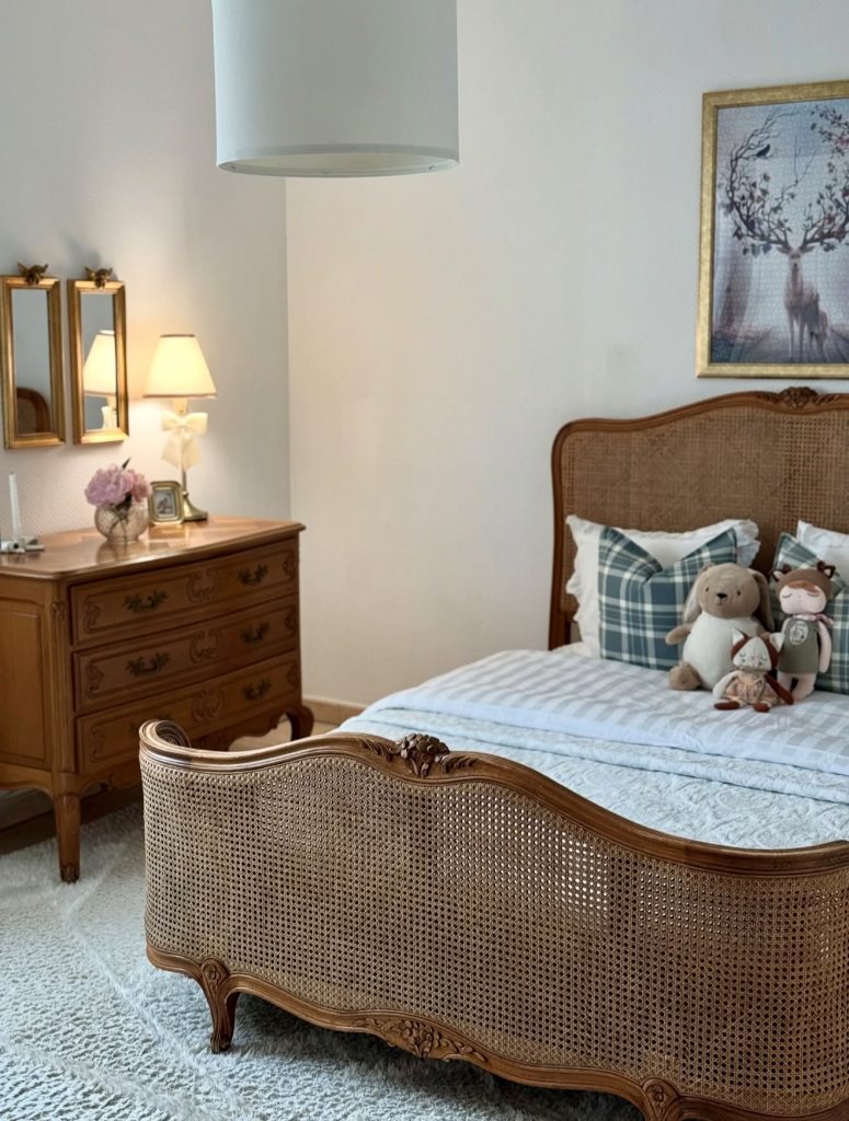Here, the aesthetic shifts toward refined vintage warmth, using carved wood furniture and woven textures to bring a timeless character into a clean, organized setting. The symmetrical mirrors, soft lamp glow, and carefully placed decor pieces keep the room from feeling cluttered, proving that the clean aesthetic isn’t exclusively modern. This style is especially popular among U.S. homeowners who want a classic atmosphere without overwhelming detail—a balance between nostalgia and simplicity. Subtle touches of beige and muted textiles anchor the palette, allowing the handcrafted furniture to shine while still fitting within today’s clean, calming trends.