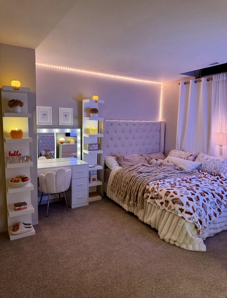This bedroom embraces a sweet, girly interpretation of clean design, where warm lighting and plush bedding create instant cozy vibes without crossing into chaos. The backlit shelving and vanity setup introduce a hint of maximalist personality—neatly arranged decor, themed items, and seasonal touches—yet everything stays controlled and aesthetically consistent. The soft grey tones of the headboard and the warm neutral carpet help ground the space, proving that a room can feel expressive and fun while still aligning with the clean aesthetic many young adults love. It’s an inviting space that balances comfort, order, and individuality.