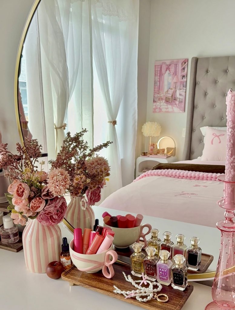 This space leans fully into a polished pink palette but keeps the room feeling clean and elevated through careful curation. The vanity arrangement—perfume bottles, pearls, florals—feels like a mini-vision board of personal style, yet the layout stays tidy enough to reflect the 2026 clean-aesthetic trend. The light filtering through sheer curtains softens the entire palette, giving the room an elegant, cozy quality that feels both girly and grown-up. Designers at The Everygirl and Apartment Therapy often highlight this balance: expressive color, intentional placement, and a focus on calm textures. This room perfects that formula.