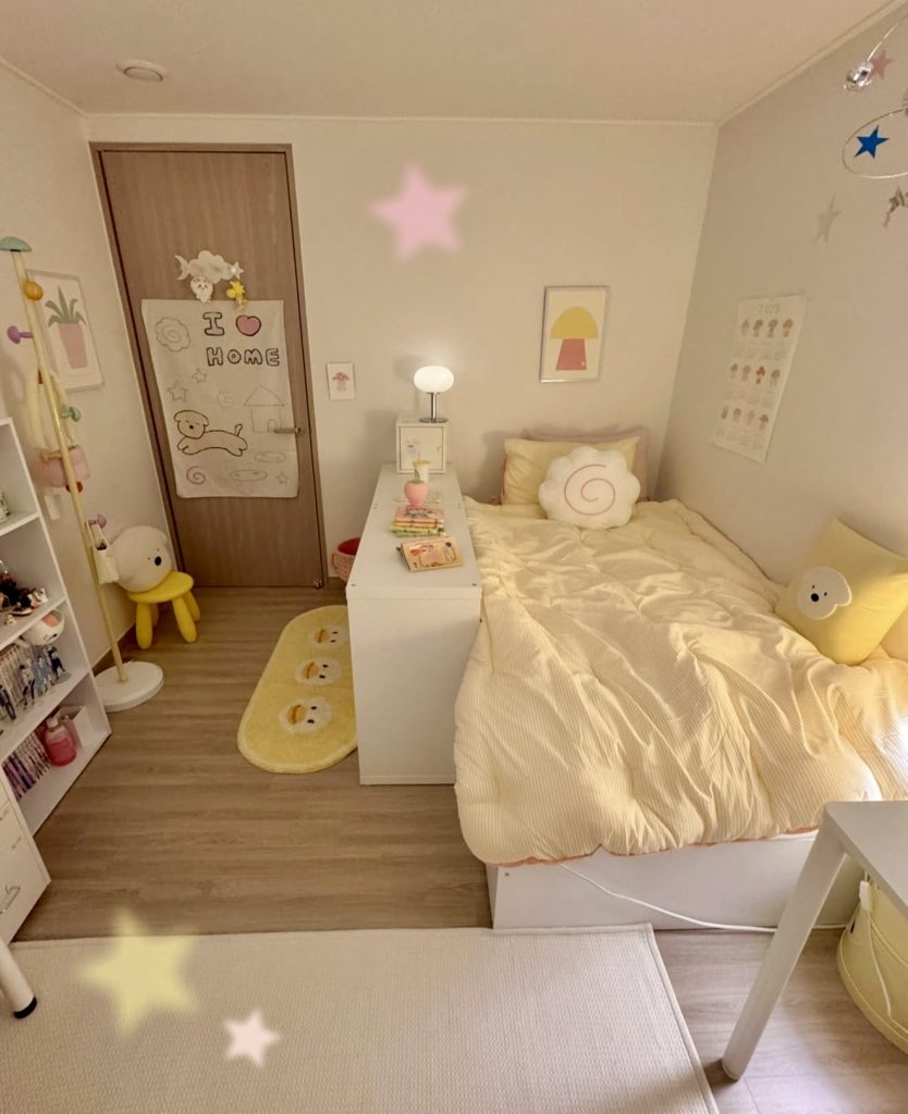 This room has a youthful but very neat look. It uses soft pastels and simple white furniture to make a fun but organized space. The bedding introduces warm yellow tones, while pillows and accents bring in subtle pink and white harmony that still maintains the spirit of cleanliness. The minimal clutter and neatly arranged bookshelves support focus and calm, while the whimsical decor elements nod to a girly sensibility that never overwhelms the space. It’s proof that the clean room aesthetic doesn’t need to be stark—cozy vibes and pink energy can absolutely coexist with order and clarity.