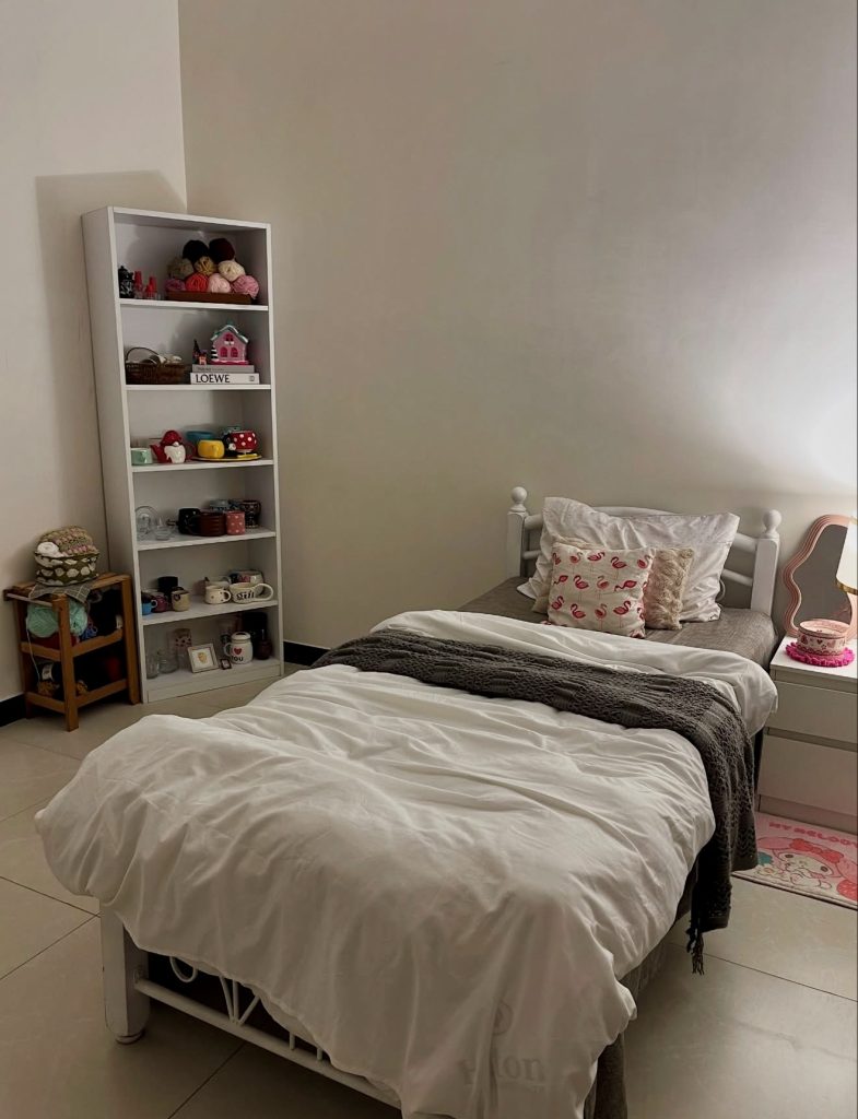 This room embraces the clean room aesthetic of 2026 through uncluttered surfaces, soft bedding, and a gently curated shelf that adds personality without overwhelming the space. The white bed frame and linens keep the room feeling open and bright, while the textured throw introduces subtle grey contrast that grounds the look. Small collectibles on the shelving unit add a hint of adorable charm, proving that minimal environments don’t have to be sterile—just intentional. It’s the kind of space that feels refreshingly calm at the end of a long workday, striking that balance between tidy and welcoming that so many Americans crave in a busy life.
