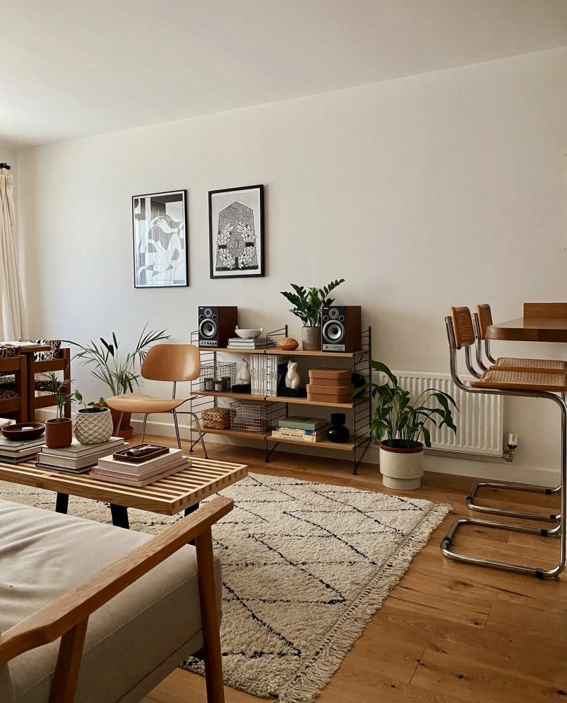 This Scandinavian-inspired living room highlights clean lines, pale wood tones, and just the right amount of greenery to create a soothing everyday space. The light rug and slatted coffee table elevate the look while keeping the room feeling airy, making it ideal for ideas for small spaces. A few framed prints add a touch of aesthetic charm without overwhelming the walls, staying true to the calm nature of Nordic-leaning décor. Warm wooden furniture pieces bring subtle warm colors into the mix, balancing the overall simplicity. For those who appreciate modern yet cozy living, this room is a perfect example of comfort through minimalism and thoughtful layering.