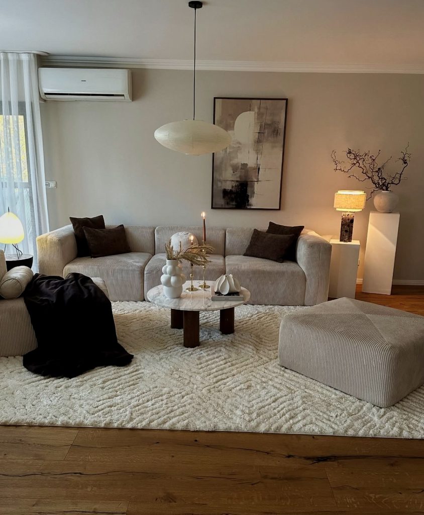 This living room leans into cozy elegance with a palette of warm colors and sculptural décor pieces that add personality without clutter. The soft glow from table lamps and candles provides subtle lighting ideas that make the room feel intimate, especially during evenings at home. Rounded furniture silhouettes bring a sense of softness that enhances the warm interior design aesthetic. The mix of textures—from corduroy upholstery to the plush rug—creates tactile interest while staying grounded in neutral tones. It’s an inviting example of how to achieve cozy sophistication with a slightly moody twist.