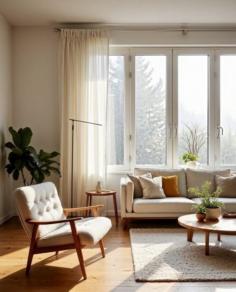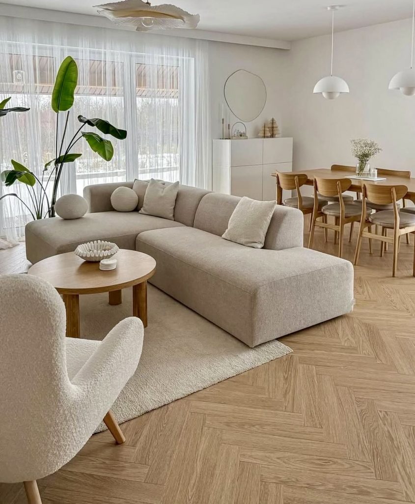 This living room brings together Scandinavian clarity and gentle warm color palettes, with soft beige furniture that creates a soothing, uninterrupted flow. The rounded shapes of the sofa and chair complement the natural wood tones, emphasizing a clean, modern aesthetic rooted in minimalism. Sheer curtains soften the sunlight, adding natural warmth that works wonderfully for ideas for small spaces wanting a light, airy feel. The open layout between the living and dining areas keeps the home visually spacious while maintaining an inviting sense of coziness. This design reads like a refined blend of simplicity and comfort, perfect for relaxed everyday living.