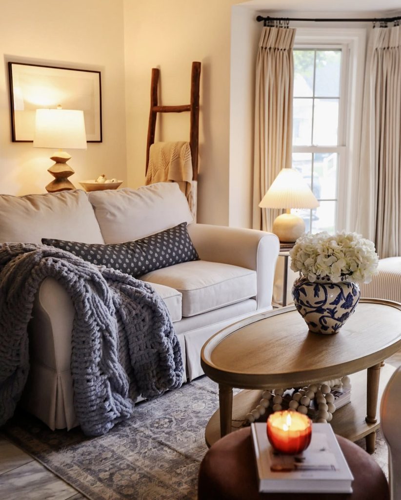 This living room leans into a familiar American coziness, pairing a plush sofa with layered blankets, soft lighting, and gentle warm colors. A ladder-style blanket holder and ceramic table lamp bring subtle traditional charm that feels timeless rather than old-fashioned. A warm-toned rug and wood coffee table introduce an earthy base that illuminates the neutral backdrop beautifully. Soft drapery and window light cast a beautiful calming glow perfect for unwinding.