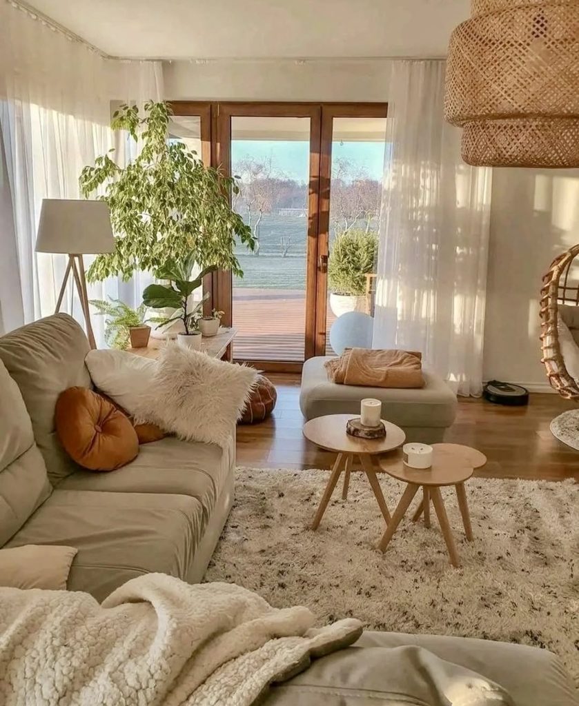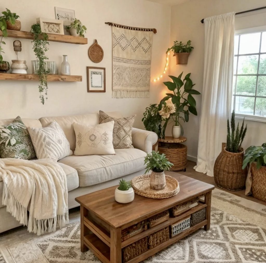 This room embraces earthy textures and botanical touches, creating a cozy oasis that feels grounded and nurturing. Soft neutrals blend effortlessly with natural wood, woven accents, and abundant greenery, reflecting a relaxed apartment aesthetic. The layered rug design adds movement and pattern without overwhelming the overall calm palette. Twinkling string lights and gentle drapery create a soft ambience that also offers subtle lighting ideas for those seeking a warm nighttime glow. This is a lovely example of warm interior design that feels collected, organic, and full of quiet charm.
