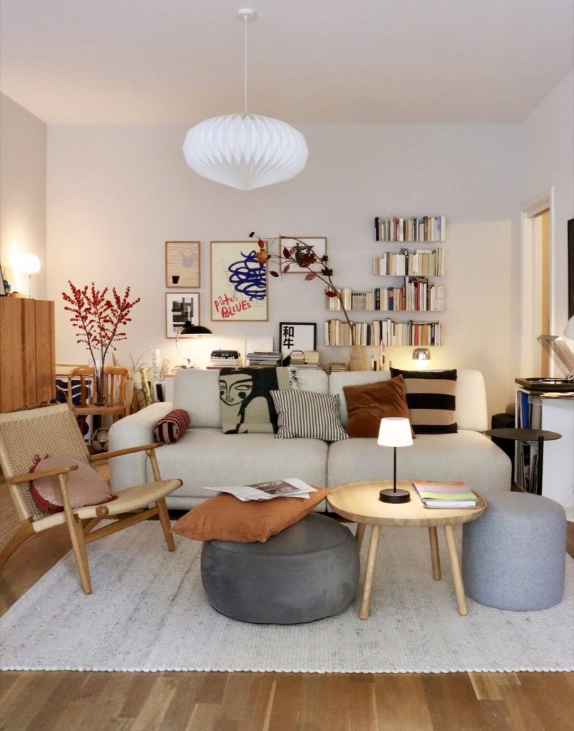 This room combines clean Scandinavian lines with thoughtful layering, giving the living space a soothing minimal feel without feeling stark. The geometric arrangement of small tables and stools adds both function and visual interest, ideal for small apartment spaces needing versatile pieces. Warm wood flooring and earthy accents soften the modern palette, creating gentle warmth throughout. The curated shelves, artwork, and sculptural branches bring subtle artistic flair that elevates the simplicity. It’s a balanced blend of calm modernity and cozy warmth, offering accessible design inspiration for 2026.