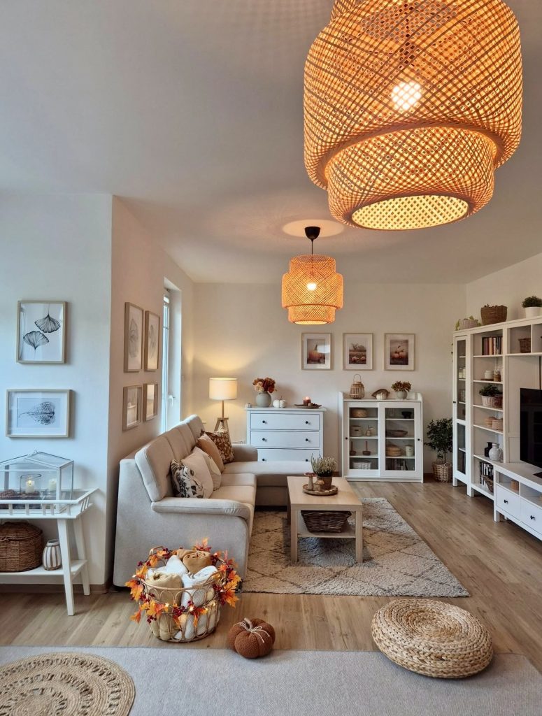 This cheerful room embraces warm colors and woven textures, giving the space a cozy, seasonal charm that feels perfect for fall but timeless year-round. The oversized pendant lamps create a welcoming glow, adding character and visual softness. Light wood furniture and layered area rugs contribute to an earthy foundation that works beautifully in small spaces. The thoughtful mix of décor—including framed prints, lanterns, and baskets—creates a curated ambiance without feeling cluttered. It’s an ideal example of apartment inspo for anyone who enjoys cozy simplicity with a hint of rustic personality.