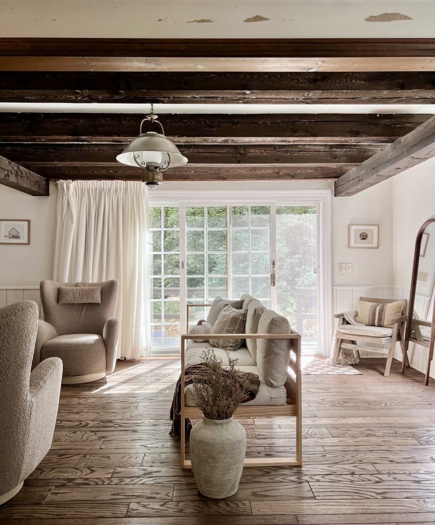 This living room brings classic farmhouse character into a modern layout, blending rustic ceiling beams with soft, light-filled seating. The large sliding doors brighten the room, making it an excellent example of airy, warm interior design. Textured chairs and warm wood flooring keep the space grounded, enhancing its earthy appeal. Even with its rustic elements, the overall feel stays elegant and inviting, making it accessible for both rural homes and suburban living. It offers fresh inspiration for anyone wanting a cozy retreat that feels timeless and authentically welcoming.