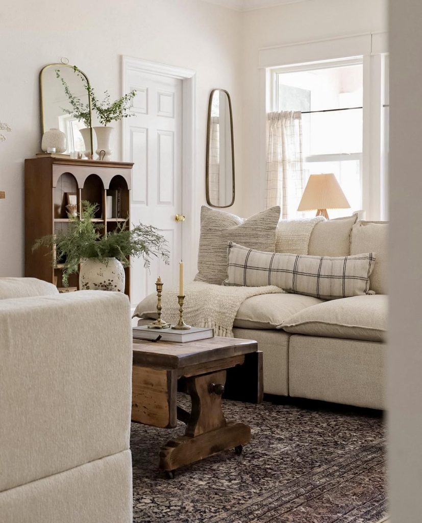 This room blends modern comfort with traditional elements, creating a quiet, thoughtful living space full of soft character. The warm-toned wood table and vintage-inspired rugs add depth, complementing the neutral palette beautifully. Soft upholstery and layered pillows give the room a naturally comfy feel suitable for everyday living. Slim mirrors and a curated shelf add visual height—an excellent trick for designs in small spaces seeking an airy effect. It’s a room that feels familiar in the best way, radiating gentle charm and everyday comfort.