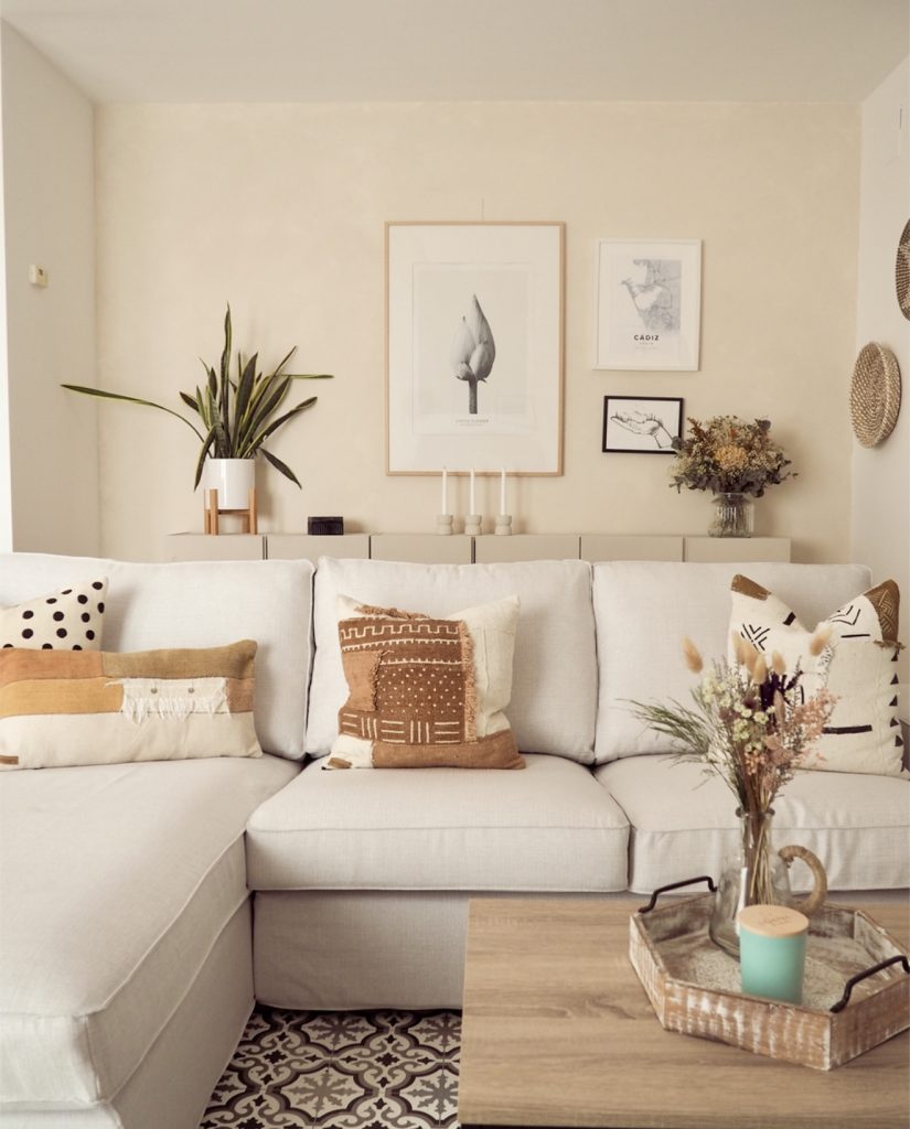 This living room embraces minimal styling while introducing warmth through textiles, ceramics, and botanical accents. The light sectional and soft beige wall set the tone for a calm, inviting environment that feels welcoming without visual noise. Layered pillows in earthy patterns bring richness, grounding the space with natural colors and texture. A simple coffee table and soft lighting keep the room serene, offering practical coziness even in small apartment spaces. The combination feels globally inspired yet distinctly modern, perfect for anyone who loves understated, comfy living.