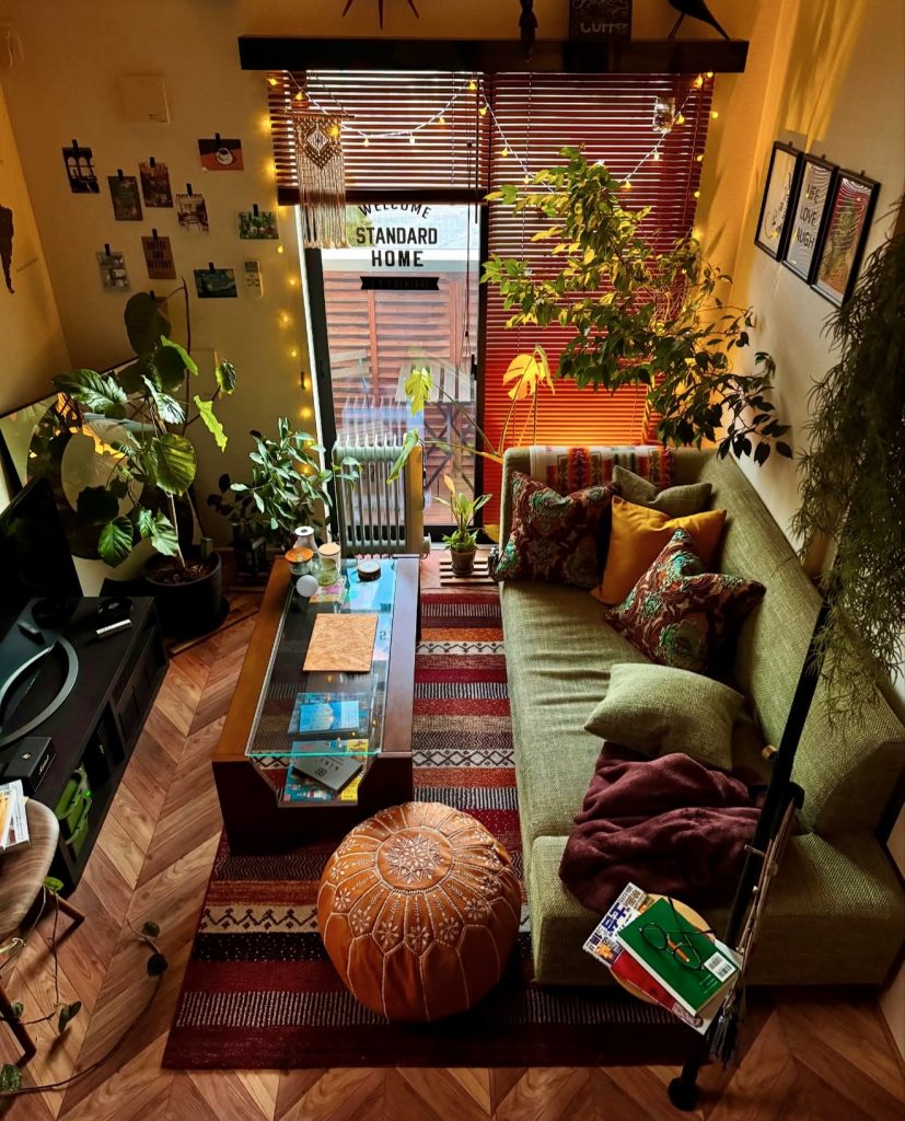 This living room uses darker, moodier hues and shows that, when styled well, they can be very comfy and inviting. It has a playful boho style with the patterned rug and green sofa, and the warm, cozy feel comes from the leather pouf and layered pillows. String lights are an easy overhead, small space, soft illumination, ambient option. This design encapsulates the curated, collected decor style that apartment inspo for 2026 features, and the space has an inspiring, lived-in feel with lots of personality. It is wonderful for recuperating after a busy workday.